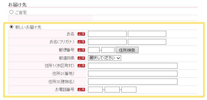 Q.お届け先を自宅以外にできますか? 可能です。 ご注文手続きをすすめていただき、 ご注文手続き内の「②.お届け先指定」ページにて可能です。「新しいお届け先」を選択し、ご入力くださいませ。
